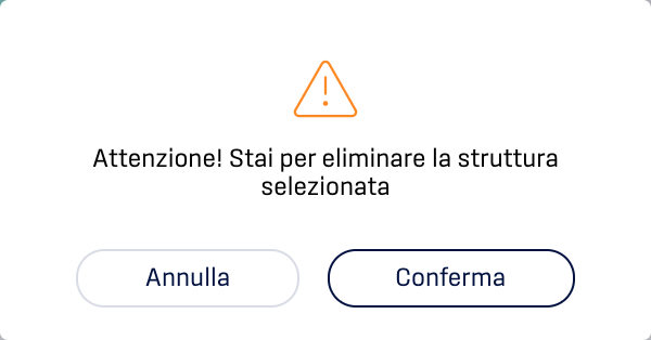 Per eliminare una struttura, accedere alla sezione Impostazioni del back office nella sezione Strutture. Selezionare la struttura da eliminare. Il sistema chiede di confermare l'operazione: per procedere selezionare Conferma.